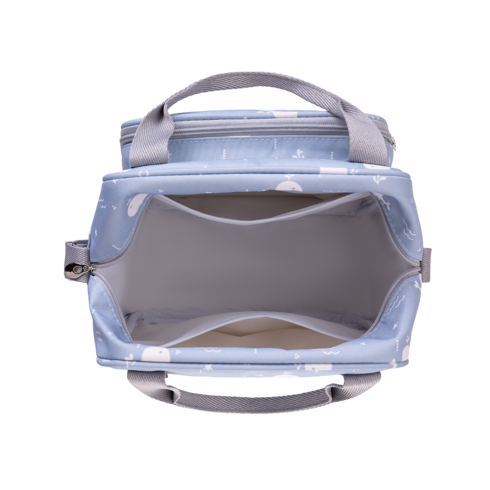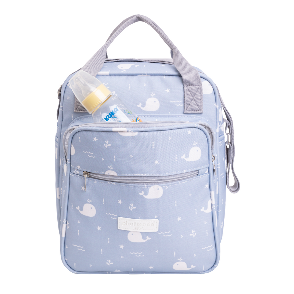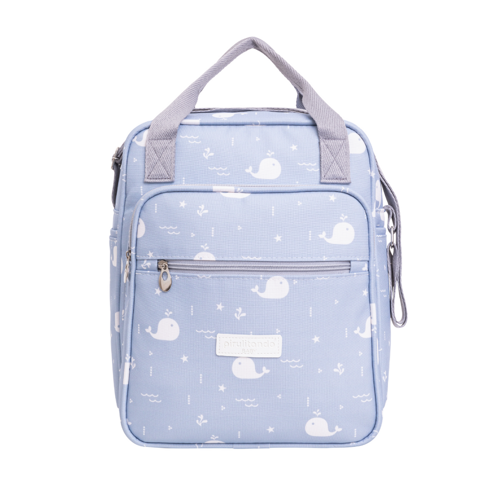 Ideal para bebés mayores o para salidas más cortas. Práctico, con bolsillos externos e internos, forro impermeable y fácil de limpiar. Dispone de correa de mano ajustable y bandolera. El bolsillo frontal es térmico con elásticos para asegurar objetos. En la parte delantera también tiene un bolsillo con cremallera para guardar pequeñas pertenencias. Y la impresión es digital, exclusiva de la marca.