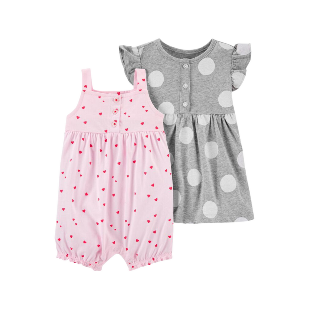 Este conjunto de Carter's es perfecto para tu bebé. Incluye un romper con diseños de pequeños corazones y un vestido con diseños de motas. Hecho de suave algodón para la comodidad de tu bebé. También incluye un cubre pañal para una mayor protección. ¡Haz que tu bebé se vea adorable con este conjunto de Carter's!