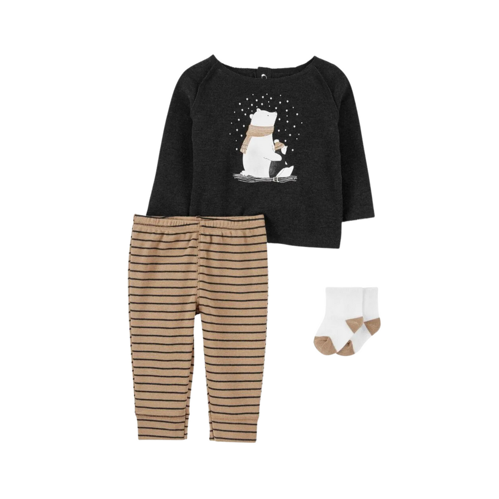 Este conjunto de Carter's incluye 1 blusa, 1 pantalón y 1 par de medias, perfecto para mantener a tu bebé abrigado durante los cambios de temperatura. Con su blusa de lana fina, mantendrá a tu pequeño cómodo y caliente mientras juega o duerme. ¡Asegura un estilo y comodidad duraderos!