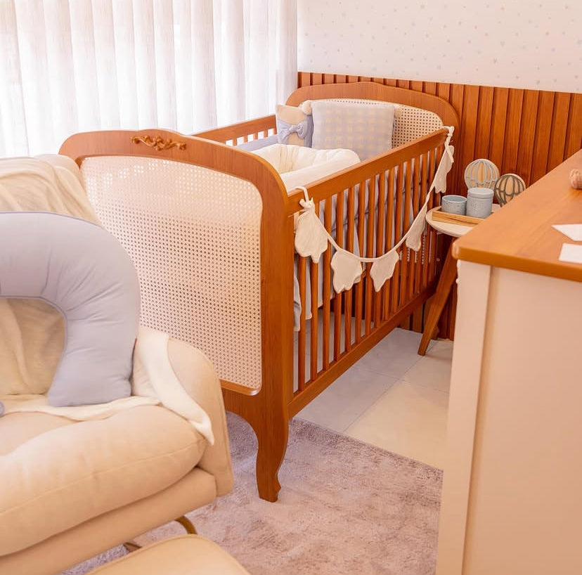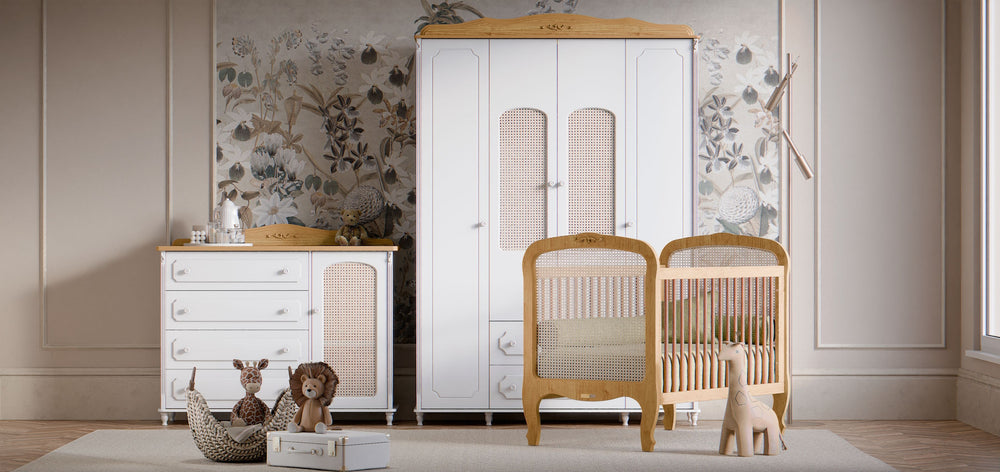La Cuna Provence Freijó combina estilo clásico y funcionalidad para los primeros años de tu bebé. Su diseño elegante, con detalles de paja en los cabeceros, aporta un toque sofisticado y cálido a la habitación.