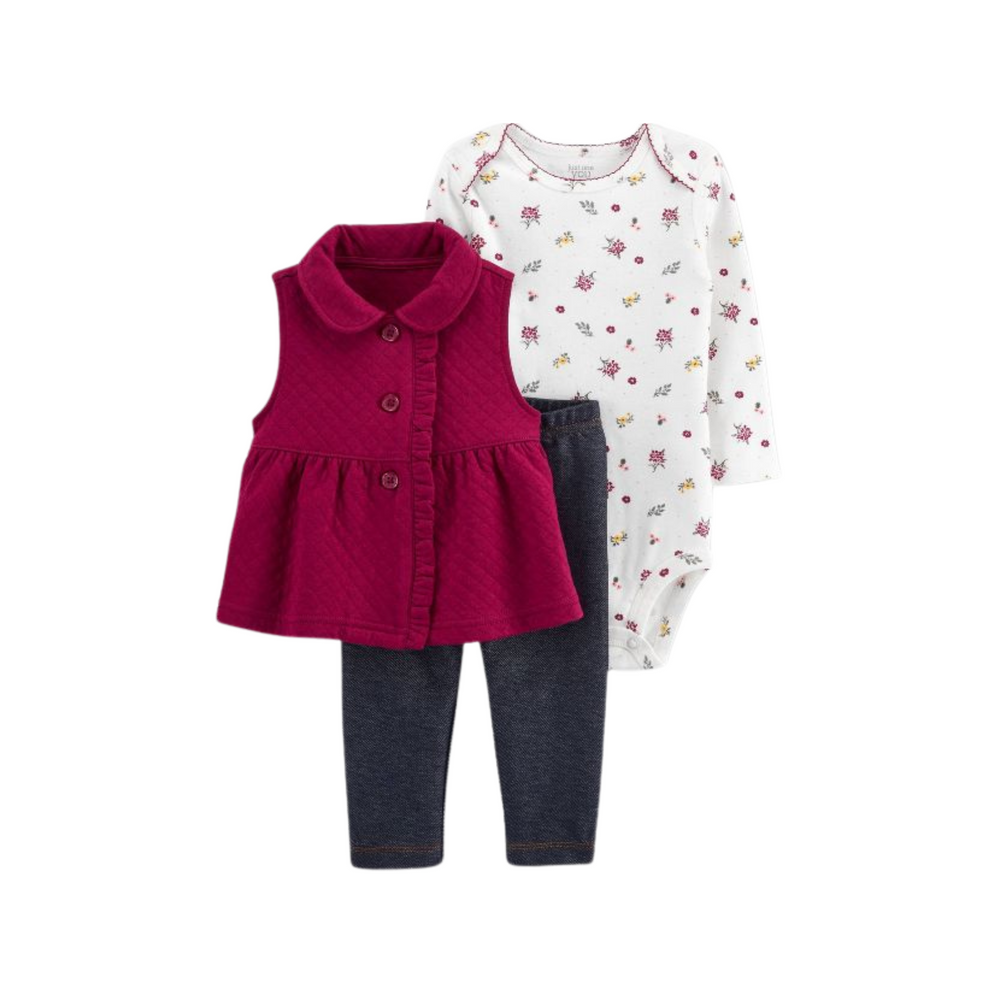 Este hermoso set con 3 piezas de Just One You By Carter's es perfecto para tu princesa. Incluye un chaleco color vino, un body de mangas largas con un encantador diseño floral y un cómodo pantalón tipo jeans. Creado con la calidad y estilo que esperas de Carter's, ¡este set es ideal para cualquier ocasión!