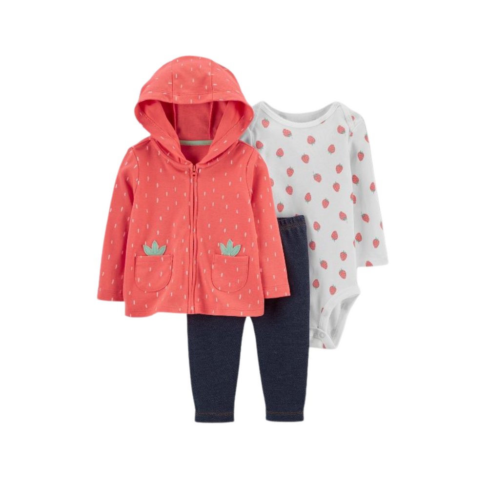 ¡Este set de 3 piezas de Just One You By Carter's es imprescindible para el guardarropa de tu pequeña! Incluye un body, un abrigo con capucha y un pantalón, con divertidos diseños de frutillas. Ideal para mantenerla abrigada y a la moda durante el otoño e invierno. ¡Haz que se sienta cómoda y linda!