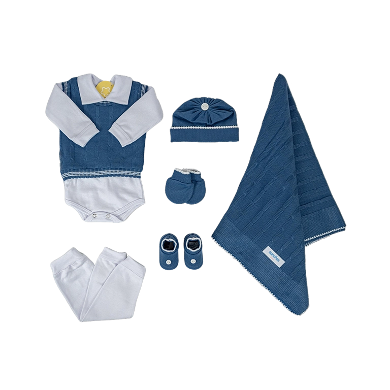 ¡Nuestro kit más completo, para que lo lleves a la maternidad sin preocupaciones! Son siete piezas ligeras y cómodas: body, chaleco, pantalón, manta, gorrito, guantes y zapatito ¿Te imaginas a tu bebé llegando a casa vestido con estas prendas? ¡Cada una de ellas fue pensada para brindar practicidad y comodidad, con mucha calidad y delicadeza!